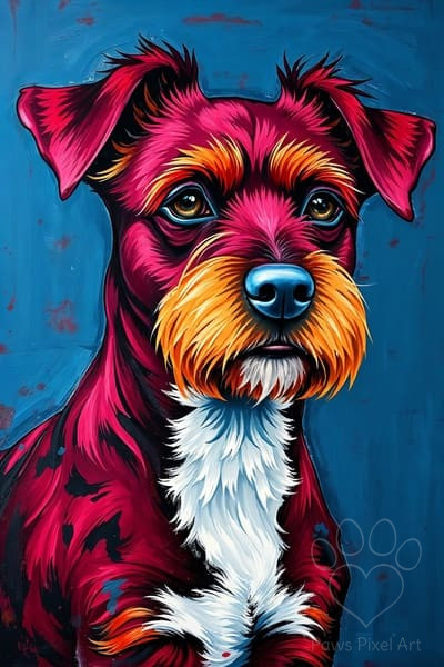 Infuse your space with energy and artistic charm with the ‘Vibrant Wire Fox Terrier Portrait – Pop Art AI Illustration’ from Paws Pixel Art. This striking digital artwork features a Wire Fox Terrier, reimagined in a bold and expressive pop art style. The dog’s distinctive wiry coat is brought to life with a dazzling palette of magenta, bright orange, yellow, and a unique blue nose, all set against a rich, textured blue background. The expressive, painterly strokes create a lively and captivating piece that celebrates the spirit of this spirited breed.